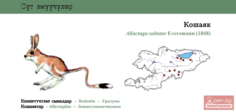 Distribution in general and in the country. Deserts of the Ural region to Southern Transbaikalia, Mongolia, Northern China. Chui steppe in Altai, most of Kazakhstan. In Kyrgyzstan, there are two subspecies of jerboas that are isolated from each other: A.S. altorum Ogn inhabits the Issyk-Kul basin and Kochkor valley, A.s. dementiewi in At-Bashi, Arpa, and Aksay [32].