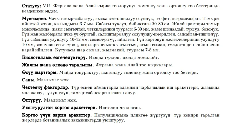 Status: VU. This rare species is endemic to Kyrgyzstan; an ornamental plant spread in the Fergana and Alai Mountain Ranges. Disseminated on metal and silty soil slopes in low- and mid-montane belts of mountains. Limiting factors: economic development of lands, pasture in spring, mass collection of flowers and rhizomes. Flowers in June, fruits in July. The number (stock in nature) is unknown. At present, it is out of any protection. The creation of special wildlife areas in sites with maximal numbers, the prohibition of cattle grazing, and the prohibition of collection of flowers and rhizomes, as well as monitoring, are recommended to protect the species.
