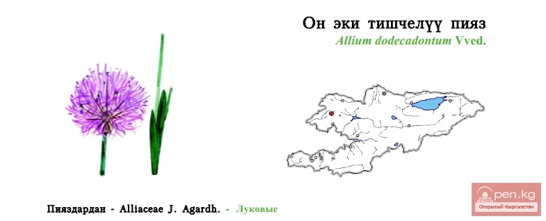 Description. A perennial herbaceous bulbous plant, geophyte, xeromesophyte. Bulbs are solitary, round, 8-10 (12) mm in diameter, with gray paper-like tunics. Bulbils are solitary, smooth. Stems are 60 - 80 cm tall, 1.5 - 5 mm in diameter, ribbed, covered at the base with leaf sheaths. There are 2 leaves, flat, 2.5 - 6 mm wide, rough-edged. The inflorescence is hemispherical or nearly round, dense, multi-flowered. Flower stalks are 1.5 - 2 cm long, glabrous at the base. The tepals of the star-shaped perianth are pink-purple, with a faintly prominent midrib, narrowly triangular-lanceolate, twisted and bent after flowering. The stamens are 1.5 times shorter than the perianth, bifid, with ciliate bases. The ovary is long-stalked, rough.