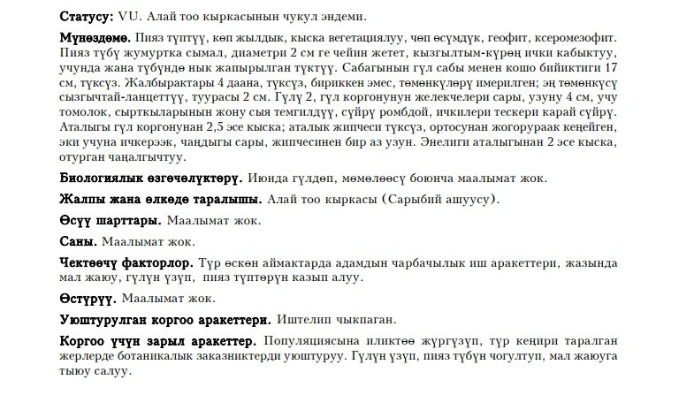 Status: VU. It is a critically endangered species, narrowly distributed endemic of the Alai Mountains (Sary-Biya Pass). The period of vegetation is short, flowers are yellow, flowering period in June; data about habitats, population, and cultivation are absent. Limiting factors: economic development of lands (pasturage in spring), massive collection of flowers and bulbs. Necessary for the species conservation: the creation of special botanical wildlife areas in sites with concentrated populations, organizing monitoring, prohibiting flower and bulb collection, and prohibiting pasturage.