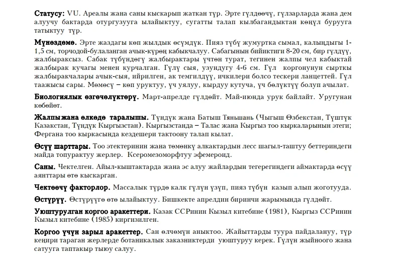 Status: VU. It is a species with a reducing area, ornamental early-flowering plant, xerophilous ephemeroid. It is spread in piedmonts in Western and Northern Tien Shan and populates silty-soil, loess, and stony slopes. The number in nature is limited and decreasing. Flowering period: March - April; fruiting in May - June; propagation is generative (by seeds), well grows in culture. The species is included in the Red Book of adjacent Kazakhstan in 1981. Limiting factors: massive collection of flowers (with bulbs) for bouquets by people, especially near settlements. Recommended protection measures: to estimate stock in nature, to optimize the usage of pasturable lands, to create a botanical wildlife area in locality with abundant population, to prohibit flower collection/trade.