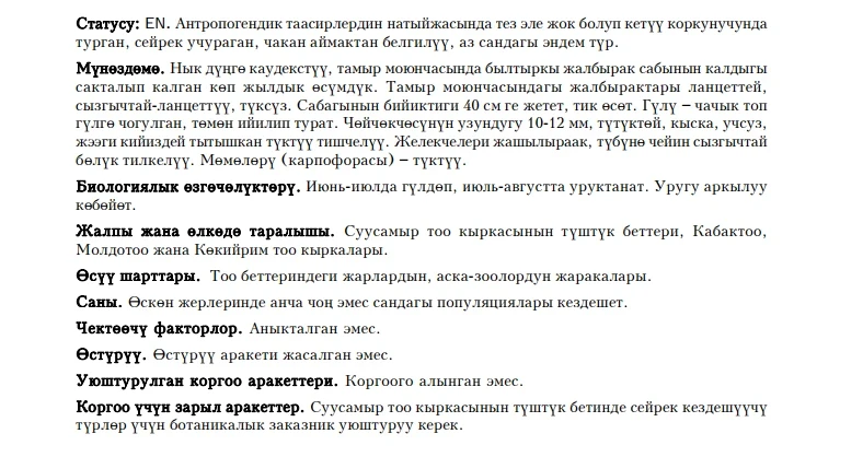 Recommended conservation measures. Create a botanical reserve on the southern slope of the Susamyr Ridge to protect the complex of rare species.
