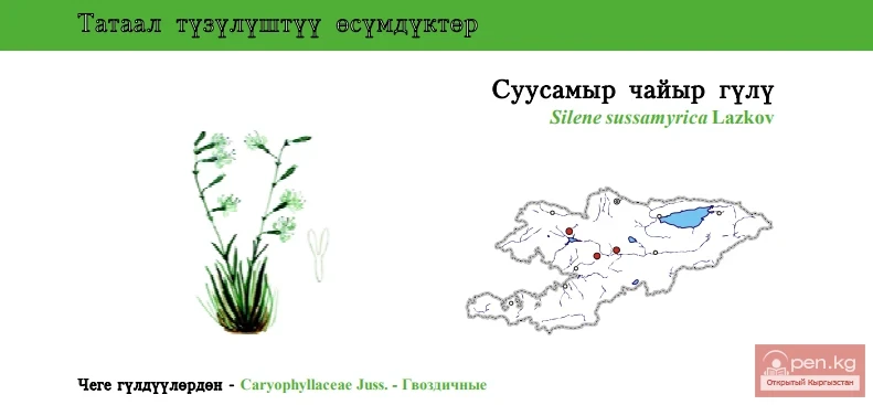 Status: EN. It is a rare species with a limited area and can easily become extinct under possible anthropogenic influence. The species is endemic to Susamyr (southern macroslope), Kavak-Too, Kokerim, and Moldo-Too Mountain Ranges and inhabits rocky clefts and stony slopes. The population is small: all populations are not numerous. Data on biology and cultivation are absent, and limiting factors are undetermined. At present, it is not under any protection. It is recommended to create a botanical wildlife area on the southern slope of the Susamyr Mountain Range for the conservation of this species and its appropriate habitats.