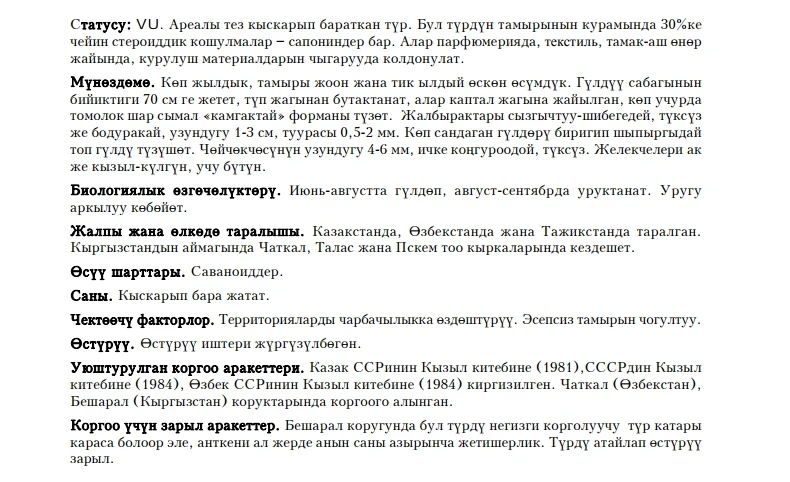 Status: VU. It is a perennial plant with reducing areas of occupancy. This plant has economic importance (roots contain up to 30% of saponins). Area of distribution: Kazakhstan, Uzbekistan, Tajikistan, Kyrgyzstan (Pskem, Talas, and Chatkal Mountain Ranges); habitats: savannas. The number in nature has a tendency to quickly decrease. Limiting factors: mass collection of roots, economic development of habitats. The species is included in the Red Books of adjacent Kazakhstan and Uzbekistan, as well as in the USSR Red Book. It is under protection in Besh-Aral and Chatkal (Uzbekistan) Nature Reserves. This plant should be one of the main objects of protection in Besh-Aral Nature Reserve, where it is still numerous. It is recommended to introduce this species into cultivation.