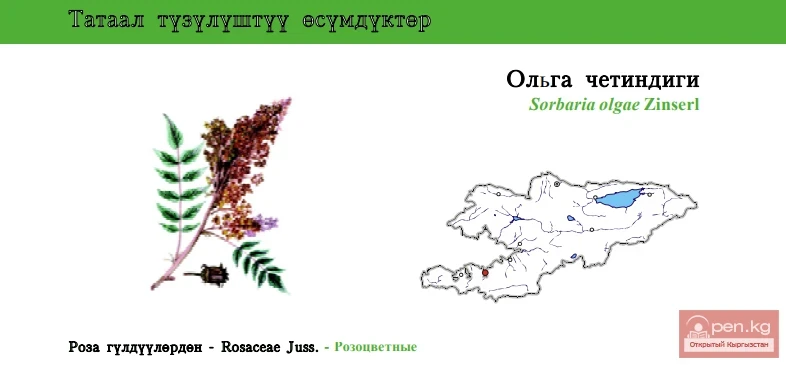 Description. A summer-green shrub with bare branches, pinnate leaves 10 - 20 cm long with sharp linear stipules, consisting of 15 - 19 leaflets. Leaflets are ovate-lanceolate, 2.3 - 5 cm long, 0.8 - 2.3 cm wide, with a doubly serrated edge, rounded or slightly narrowed at the base, sharp or slightly elongated at the top, glabrous on top, with single simple hairs along the veins on the underside. The inflorescence is 15 - 25 cm long and 8 - 15 cm wide, glabrous. The leaflets are glabrous, 2 - 3 cm long, and deflected.