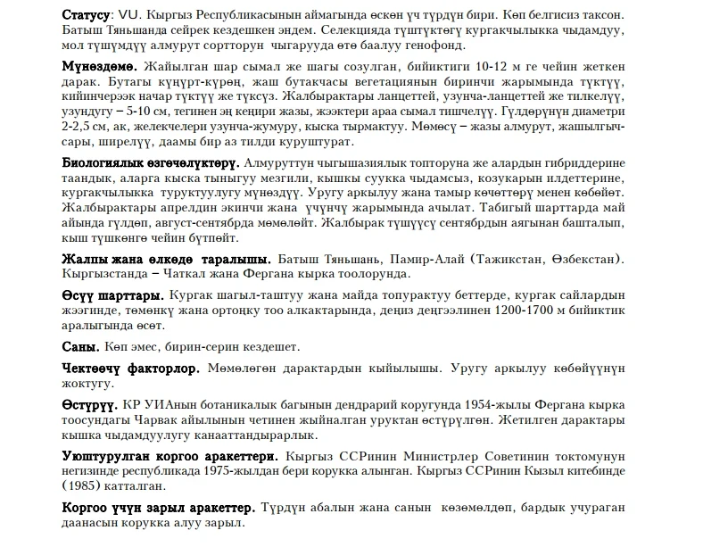 Status: VU. One of three species growing in the territory of the Kyrgyz Republic. The taxon is little known. A narrow-local endemic of the Western Tien Shan. A valuable genetic resource for the selection of drought-resistant high-yield southern pear varieties.