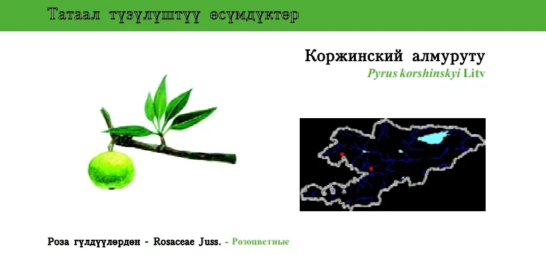 Status: VU. It is a narrow-spread little-known species endemic to West Tien Shan and Northern Alai-Pamirs, one of three Kyrgyz congeners. Single individuals occur in the Chatkal and Fergana Mountain Ranges at dry metal, silty-soil, and stony slopes, in the bottoms of dry gorges in low- and mid-montane belts, at 1,200-1,700 m above sea level. It is a valuable species for genetic resources and for the selection of drought-resistant pear cultivars. Period of flowering: May, fruiting is in August - September, reproduction is by seeds and root-layers. The population in nature is insignificant. Limiting factors: felling of trees, absence of generative reproduction. P. korshinskyi is cultivated in Bishkek Botanical Garden and is included in the list of endangered and protected species since 1975 by a special Government Decree of the Kyrgyz SSR. It is necessary to estimate the number and area, to organize monitoring for the population and habitats, and to protect all trees found.