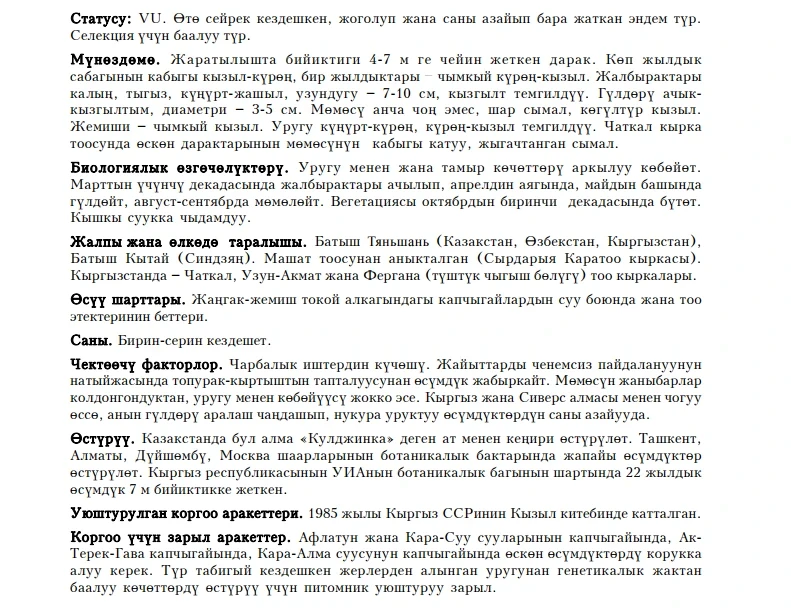 Status: VU. This relic species is endemic to Tien Shan, one of three Kyrgyz congeners. It was described from Mashat Mountain (Syrdar Karatau Mountain Range) and is known in Western Tien Shan and Xinjiang; in Kyrgyzstan, it is spread in the Chatkal, Uzun-Akhmat Mountain Ranges, and in the southeastern part of the Fergana Mountain Range. Single individuals sparsely occur in the walnut and fruit forest zone. Period of flowering: end of April - beginning of May, fruiting in August - September; reproduction is both generative (by seeds) and vegetative (by root layers). It is a valuable species for genetic fund and for the selection and breeding of apple cultivars; the species is widely spread in culture. Limiting factors: economic activity in habitats (plants are weakly resistant to soil compression caused by pasturage), absence of generative reproduction caused by the fruits being eaten by animals, degeneration due to cross-pollination when the species sprouts amongst Sievers’ apple trees. The species is included in the Red Data Book of the Republic since 1985. Trees in Aflatun, Kara-Suu, and Kara-Alma Ravines and in Ak-Terek-Gava localities should be especially protected. The organization of a special arboretum is needed for plants received from natural seeds that are pure in genetics.