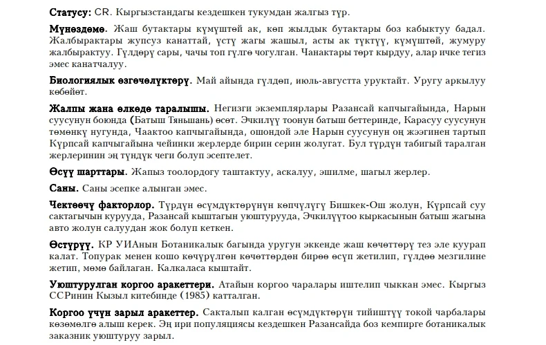 Limiting factors. A significant portion of the plants has been destroyed during the construction of the Bishkek-Osh highway, the Kurp-Sai reservoir, the establishment of a settlement in Razan-Sai, and the construction of a road along the western slope of the Echkilit-Too ridge.