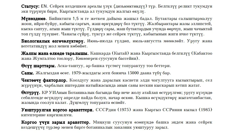 Status: EN. This ornamental evergreen shrub is a rare species with a disjunctive area and is the only representative of the genus in Kyrgyzstan. It has value as a medicinal plant and is an important element of the genetic fund. It is known from Kashgaria (China) and the area limited by the Kokomeren River basin (Kavak-Too and Dzhumgal Mountain Ranges). Plants occur on slopes with sod-less soil on particolored bedrocks, in the mid-montane zone. Period of flowering: June - July, fruiting in July - August; propagation is both generative and vegetative. Cultivation is problematic: in Bishkek Botanical Garden, all seedlings were lost the following winter. The number was about 15,000 individuals in 1979; present data are not quantitative. Limiting factors: anthropogenic influence (including collection) and erosion of slopes. This plant is included in the Red Books of the USSR and Kyrgyzstan and is protected in the Min-Kush botanical wildlife area. It is recommended to expand the territory covered by preservation measures.