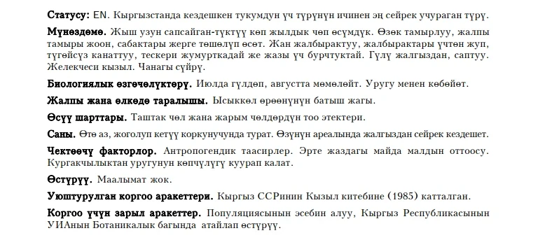Status: EN. It is a narrowly distributed species, the rarest among four congeners, endemic to Kyrgyzstan. These perennial herbaceous plants occur as single specimens in desert and semi-desert stony piedmont plains in the western part of the Issyk-Kul Hollow only. It flowers in July and fruits in August; propagation is generative (by seeds). The population is critically insignificant. Information about cultivation is absent. Limiting factors: anthropogenic influence (cattle pasturage in the spring period) and weak reproduction (loss of seedlings in cases of drought). This plant is included in the Red Book of the Republic, but its areas of occupancy are still outside the territories of any protected areas. Monitoring of populations and introduction into cultivation in the Bishkek Botanical Garden are recommended.