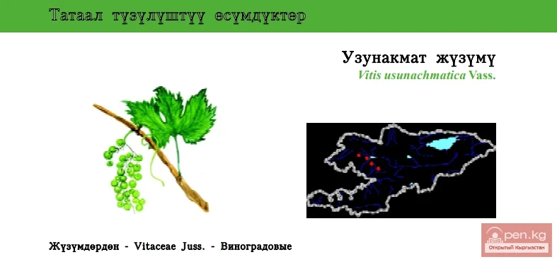 Status: VU. This species of large liana is endemic to Western Tien Shan and is spread in the Uzun-Akhmat, Chatkal, Atoinok, Tchaak-Too, and Fergana Mountain Ranges. The species has value as a food plant and for grape selection. It populates bottomlands in ravines and sometimes slopes; the number is insignificant. Period of flowering: May, fruiting in late August and September; propagation is generative (by seeds) in nature, while in cultivation propagation is possible by grape cuttings (vegetative). It is cultivated in Bishkek Botanical Garden (since 1956) and in private gardens in Tash-Kumyr and Kara-Kul; some specimens hibernate without shelters. Limiting factors: intensive economic development of lands and damage to plants by grape collectors. This plant is included in the Red Book of the country and is protected in the Ryazan-Sai botanical wildlife area. Monitoring of the population is recommended for the conservation of the species.