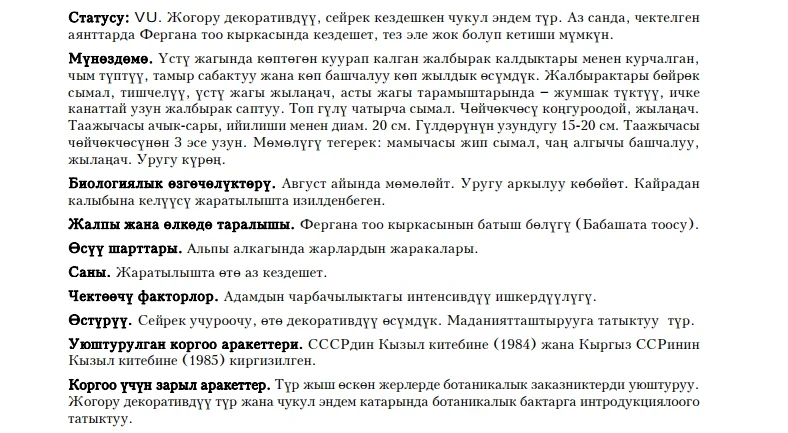 Status: VU. A narrow endemic rare, highly ornamental species. Found in small quantities over a limited area in the Fergana Range, it may quickly disappear.