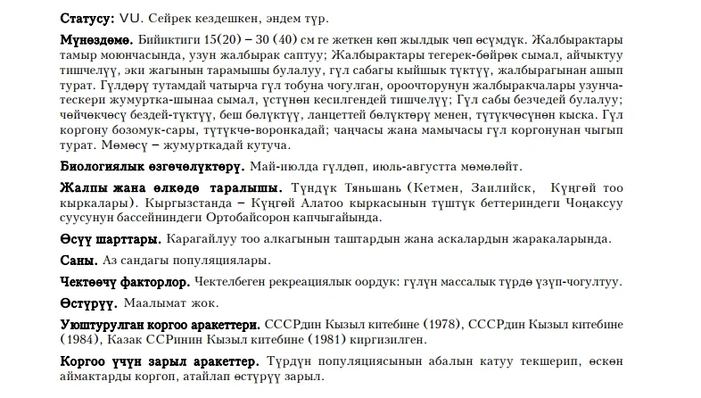 Status: VU. This rare species is endemic to Northern Tien Shan (Transiliense and Ketmen Mountains in Kazakhstan and Kungei Ala-Too in Kyrgyzstan), and occurs in small numbers in the belt of spruce forest, where it populates rocky clefts. Only one population in the country is known, in the Orto-Baisoorun locality in the Tchon-Aksu River basin. Period of flowering: May - June (sometimes July, depending on the elevation), fruiting in July - August. There is no exact information about reproduction and numbers in nature as well as about cultivation. Limiting factors: excessive recreational influence on habitats, mass flower collection. The species is listed in the USSR Red Book (1978, 1984) and in the Red Book of Kazakhstan (1981). Conservation measures necessary for this species include monitoring of the population, protection of habitats, and introduction into cultivation.