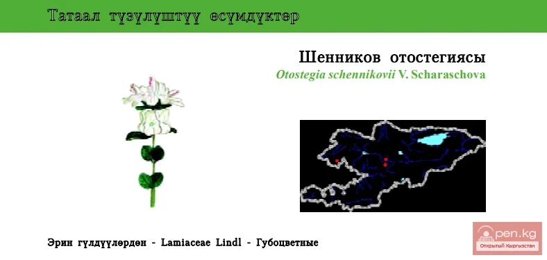 Status: VU. This stocky semi-shrub plant is a rare little-studied endemic of the Western Tien Shan with a disjunct area. The species is still known from only three sites: on the southern slope of Chatkal (near Shekaftar village), in Moldo-Too (Karagatty gorge), and Ak-Shyirak-Western Mountain Ranges. The plant occurs on slopes with particolored bedrocks of southern exposition, flowers in July; propagation is generative (by seeds). The number in nature is very small, and information on cultivation is absent. The major limiting factor is excessive cattle pasturage. The species is without any protection despite being included in the Red Book of the country. It is recommended to create a botanical wildlife area for the conservation of this species and to introduce it in the Bishkek Botanical Garden.
