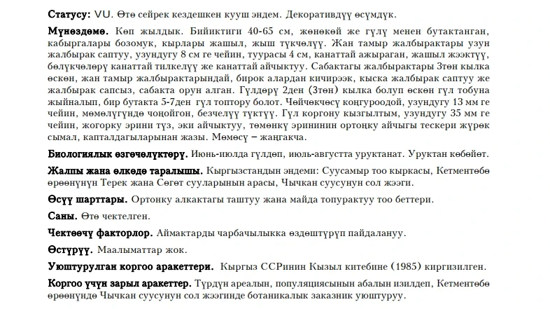 Status: VU. This ornamental perennial plant is a rare narrowly endemic of Kyrgyzstan. The specific area is limited to the northern low- and mid-montane part of the Ketmen-Tyube Hollow (Chychkan Ravine, southeastern spur of the Talas Mountain Range, and southern slope of the Suusamyr-Too Mountain Range). Plants occur on rocky and stony slopes, mainly with an eastern exposure. Period of flowering: June - July, fruiting in July - August; propagation is generative (by seeds). The number in nature is very insignificant. Limiting factors: land development in habitats. The species is unknown in cultivation and in territories of existing protected areas, despite being listed in the Red Books of Kyrgyzstan. It is recommended for species’ conservation to create a botanical wildlife area on the left slope of Chychkan Ravine and to organize monitoring for all populations and area.