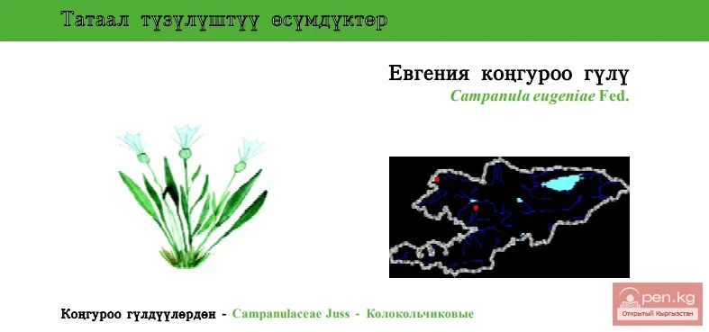 Status: VU. This ornamental perennial plant is endemic to Western Tien Shan, mosaic-distributed and the rarest of six congeners in Kyrgyzstan. The species occurs in the Talas and Fergana Mountain Ranges and populates clefts in marble rocks in mid-montane and subalpine belts. Period of flowering: May - August, fruiting in June - September; propagation is generative (by seeds) only. The number in nature is limited; information on cultivation is absent; at present time it is out of any protection. Land development is the limiting factor. It is recommended to identify the areas of occupancy and create botanical wildlife areas for the species’ conservation.