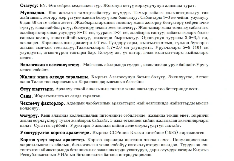 Status: EN. It is critically endangered, a very rare narrow-spread species, distributed in the Alexander (only in the western part), Etchkili-Too, Ak-Tash, and Talas Mountain Ranges (Kara-Koyun River basin). This ornamental plant occurs as single individuals on stony and metal slopes in the juniper forest zone. Period of flowering: May - June; propagation is generative (by seeds); the plant is unstudied in culture. The limiting factor is anthropogenic influence (excessive pasturage in the summer period). Currently, there are no developed special methods for preservation, despite its inclusion in the Red Book of the country in 1985. It is necessary to study the biology and propagation in nature, introduce it into culture in botanical gardens, and create protected territories in places with concentrated populations for conservation.