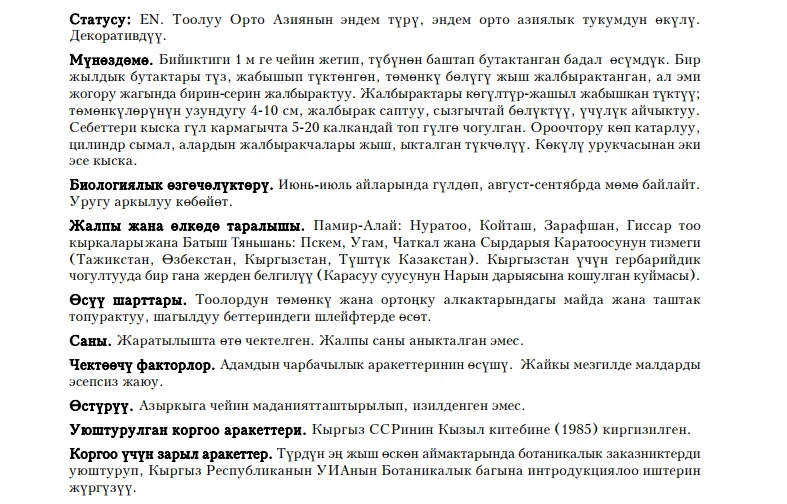 Status: EN. It is a little-known representative of the Middle Asian endemic genus, distributed in the Ugam, Pskem, Chatkal, Kurama, Turkestan, Zaravshan, and Hissar Mountain Ranges. In the Republic, it is known from herbarium samples from the northwesternmost Kyrgyzstan at the Kazakh border (VI. Tkatchenko’s personal communication) and at the junction of the Naryn and Kara-Suu rivers (right tributary of Naryn). It is a very rare ornamental shrub plant that populates silty-soil and stony slopes and screes in low- and mid-montane zones. Period of flowering: June - July, fruiting in August - September; propagation is generative; the plant is unstudied in culture. Limiting factors: an increase in human economic activity in habitats, excessive pasturage during the summer period. The conservation of the species should be supported by its introduction in the Bishkek Botanical Garden and by the creation of botanical wildlife areas in places with abundant populations.