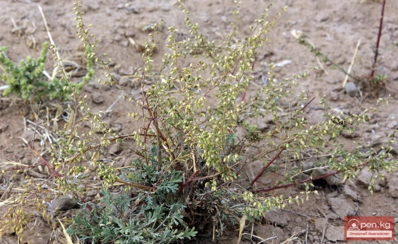 Artemisia annua. A weedy green plant with a pleasant smell of ripe apples. The stem is 15—150 cm tall, green or reddish. The leaves are light green, twice or thrice pinnately dissected. The flower heads are collected in a paniculate inflorescence. It blooms in July — August and bears fruit in August — September. It grows in gardens and vegetable gardens, in fields, in squares and parks, throughout the agricultural zone of Kyrgyzstan. Near ditches and in fields, it forms thickets.