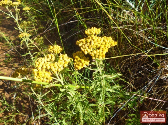 Beardless Livewort. A perennial herbaceous plant up to 40-50 cm tall. The leaves are repeatedly thrice-divided into thread-like lobes. The flowers are yellow. It blooms in May-June and bears fruit in July-August. It grows in semi-deserts and steppes, on the foothills of the Kyrgyz and Alai ranges and in Fergana on clay soils. In southern Kyrgyzstan, it is found in wheat and mixed grass steppes. Previously, yellow dye was obtained from its flowers, which was even a subject of trade with China.