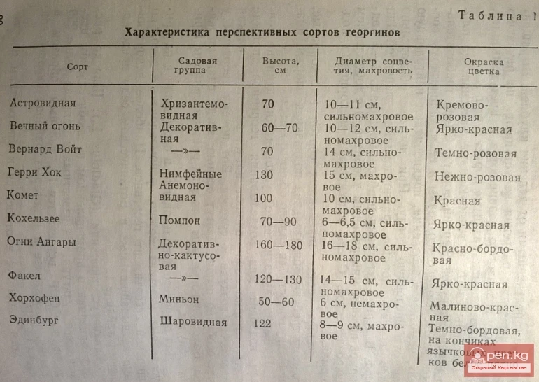 For widespread use in landscaping and on garden plots, a fairly wide range of dahlias can be recommended. The most decorative ones grown in the Botanical Garden are presented in Table 1.