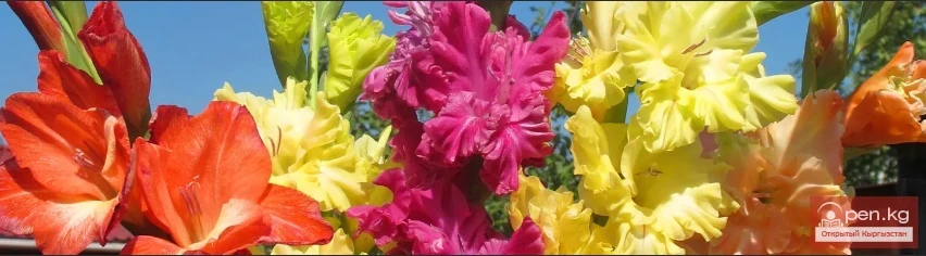 Gladiolus leaves are sword-shaped, erect, and bright green. The flower stalks have 3-4 leaves, are sturdy, and have one-sided, two-sided, or spiral arrangements of flowers that open sequentially from the bottom up; sometimes, fruits are formed—three-celled capsules with numerous seeds. The color of the flowers is very diverse, represented in all color ranges.