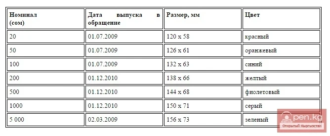 All banknotes and coins of the national currency have the status of official means of payment on the territory of the Kyrgyz Republic and must be accepted as a means of payment regardless of the year of issue.