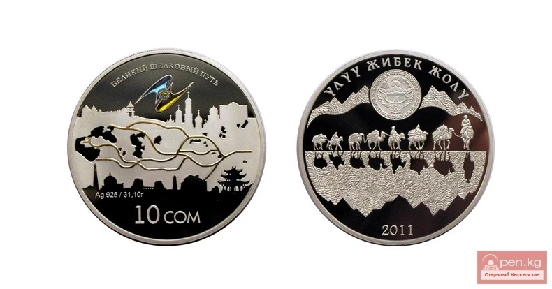 Since December 20, 2011, the National Bank of the Kyrgyz Republic has introduced into circulation a collectible silver coin "Great Silk Road" with a denomination of 10 som as part of the International program of the Eurasian Economic Union countries for the issuance and sale of collectible coins made of precious metals.