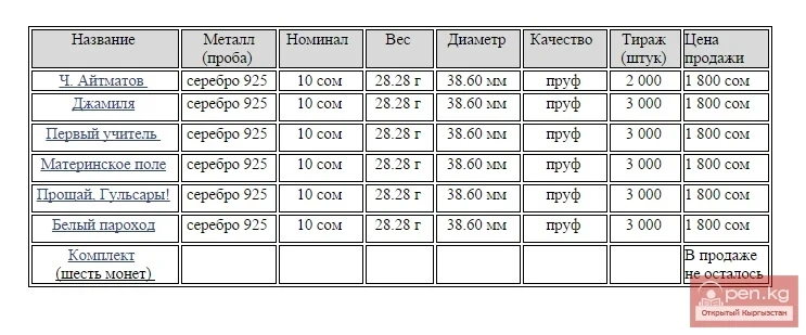The coins have been in circulation since May 4, 2009, and have the status of official means of payment in the territory of the Kyrgyz Republic. The coins are issued in single boxes and as a complete set of all six coins. Each coin comes with a certificate and a booklet with a description.