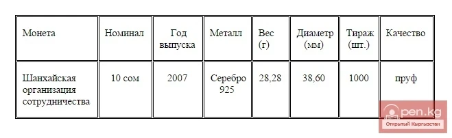 Since April 2, 2007, the National Bank of the Kyrgyz Republic has put into circulation a collectible coin "SCO," dedicated to the Shanghai Cooperation Organization.