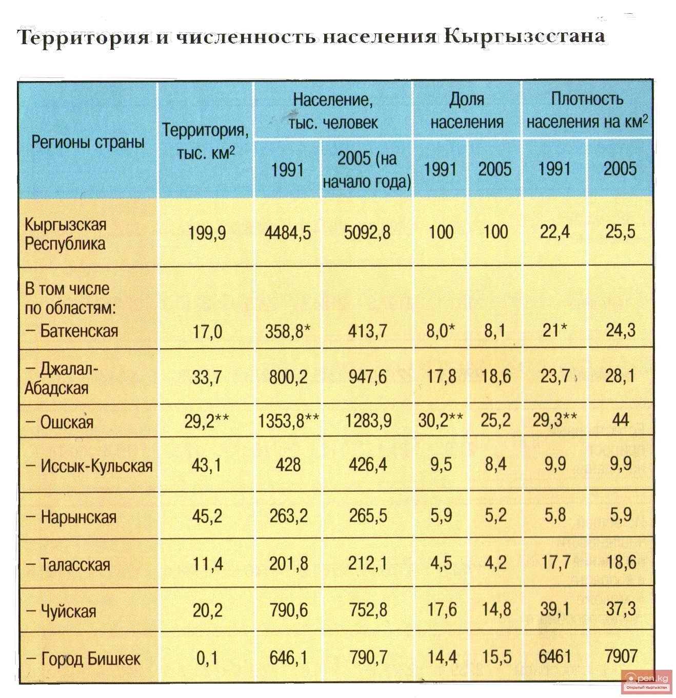 The situation in Osh region requires separate explanation. The population decrease of 5.2% from 1991 to 2005 is related to the fact that in 1991, Batken region was part of Osh region. However, examining the dynamics of the population in Osh region from 2000 to 2005, there was an increase of 8%.