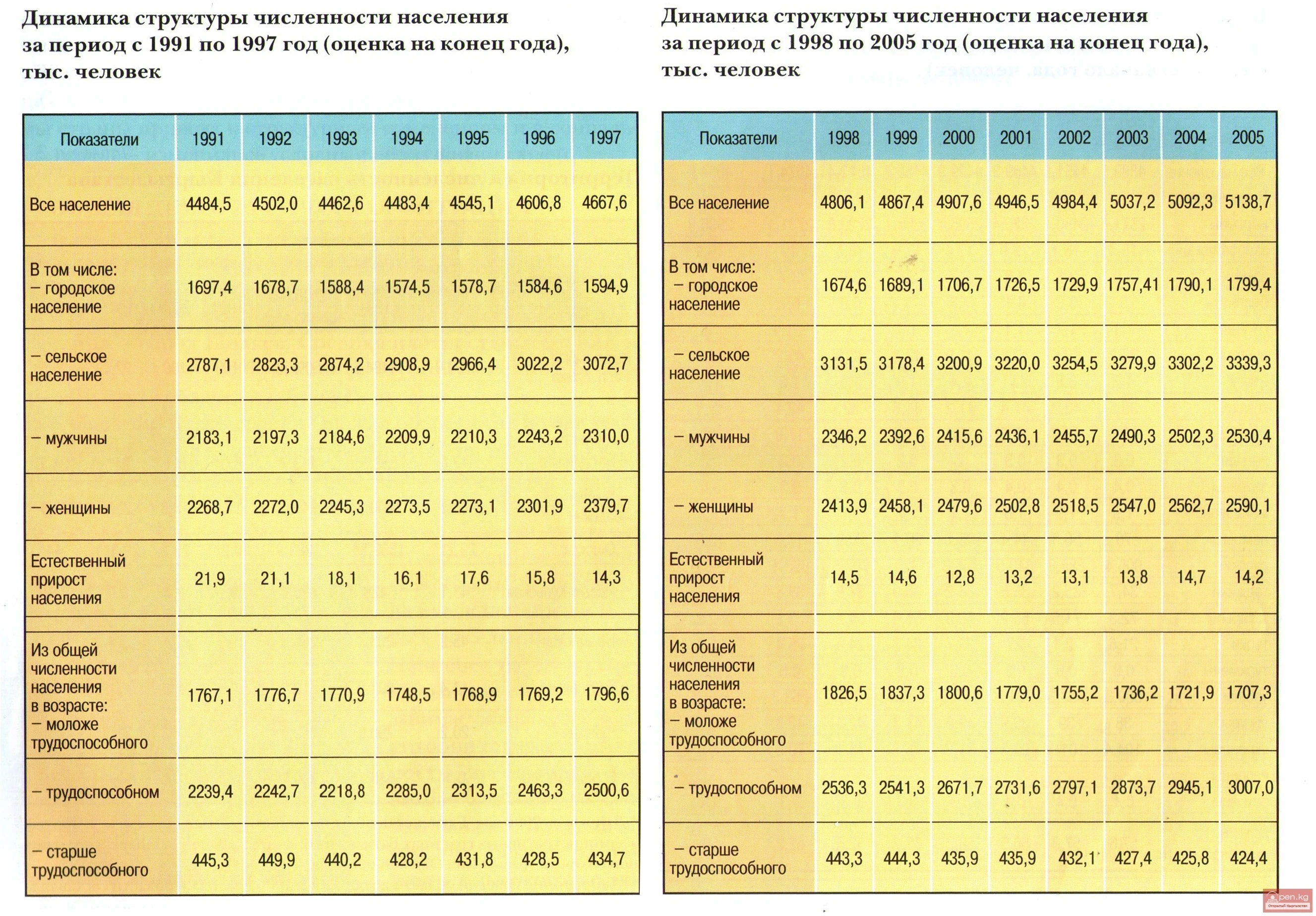 From 1991 to 2005, the population of the country increased by 608.3 thousand people, or by 13.6%, reaching 5 million 92 thousand people by the beginning of 2005. The urban population grew by 102 thousand people, or by 6%, while the rural population increased by 552.2 thousand people, or by 19.8%.