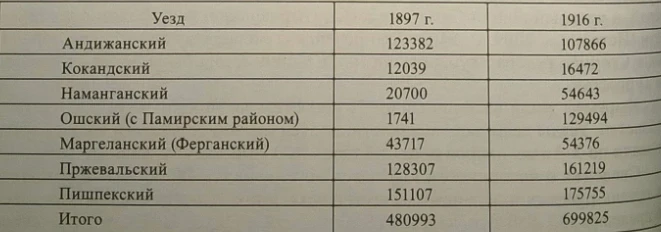 Compiled from: The First General Census of the Population of the Russian Empire. 1897. P. 2-3; Statistical Yearbook 1917-1923 / ed. D.P. Krasnovsky. Tashkent, 1924. Vol. I. 4. 3. P. 40-44; Statistical Review of the Fergana Region for 1914 / Skobelev, 1917. P. 15.