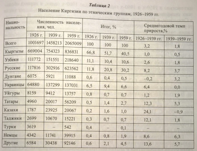 According to the All-Union Census of 1926, the population of the Kirghiz ASSR was only 993 thousand people, of which 66.6% were Kyrgyz, 11.7% were Russians, and 21.7% were other ethnicities (Modern... 1975. p. 99). For the first time during the census, it was determined that representatives of 48 different ethnic groups lived on the territory of the republic.