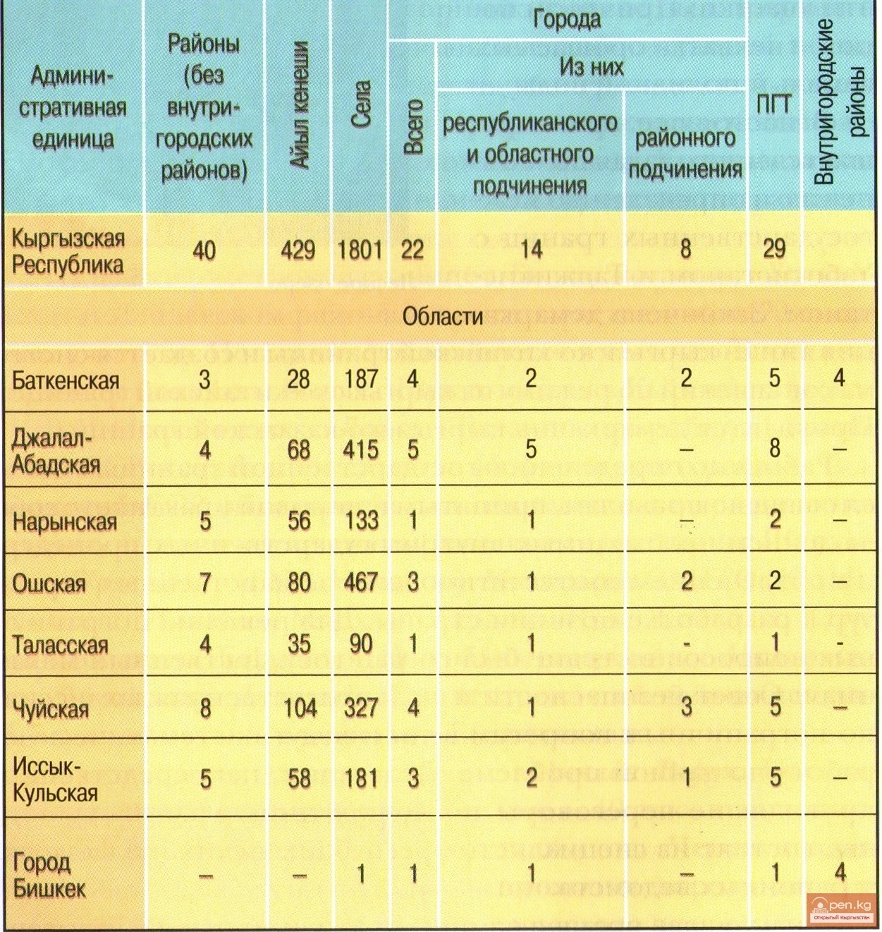 Administratively, the territory of Kyrgyzstan is divided into 7 regions: