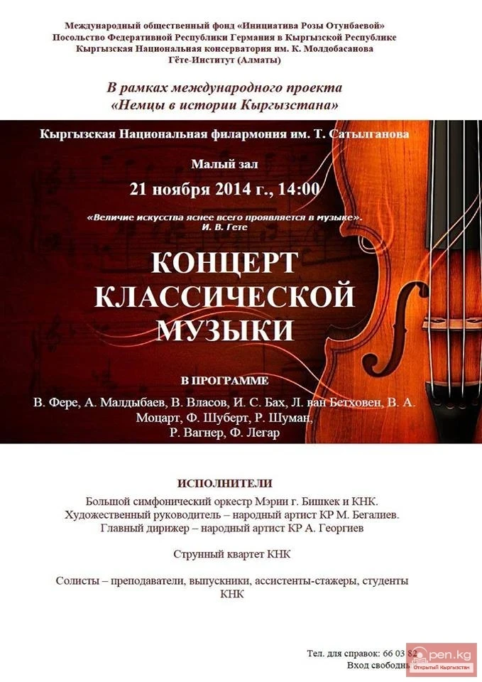 On November 21 (Friday), as part of the project "Germans in the History of Kyrgyzstan," a CONCERT OF CLASSICAL MUSIC will take place. Organizers: International Fund "Rosa Otunbayeva Initiative," the Embassy of Germany in the Kyrgyz Republic, the Conservatory, Goethe-Institut. Small Hall of the T. Satylganov Philharmonic. Starts at 14:00. Free admission. The program includes works by: Vladimir Fere, Abdylas Maldybaev, Vladimir Vlasov, Johann Sebastian Bach, Ludwig van Beethoven, Wolfgang Amadeus Mozart, Franz Schubert, Robert Schumann, Richard Wagner, Franz Lehár. Performers: The Large Symphony Orchestra of the Mayor's Office, soloists - teachers, graduates, students of the KNK. Free admission.