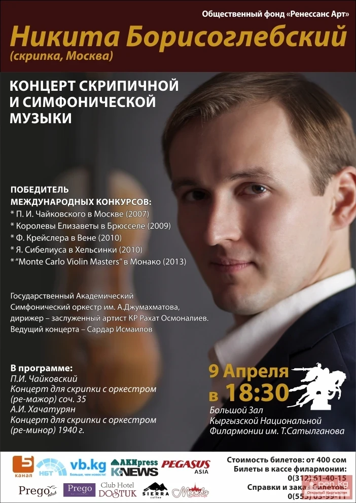 We invite you to the concert of one of the most outstanding violinists in the world, Nikita Borisoglebsky (Moscow), which will take place on April 9th at 18:30 in the large hall of the philharmonic. Tickets are available at the philharmonic box office. Prices range from 400 to 600 som. Welcome!
