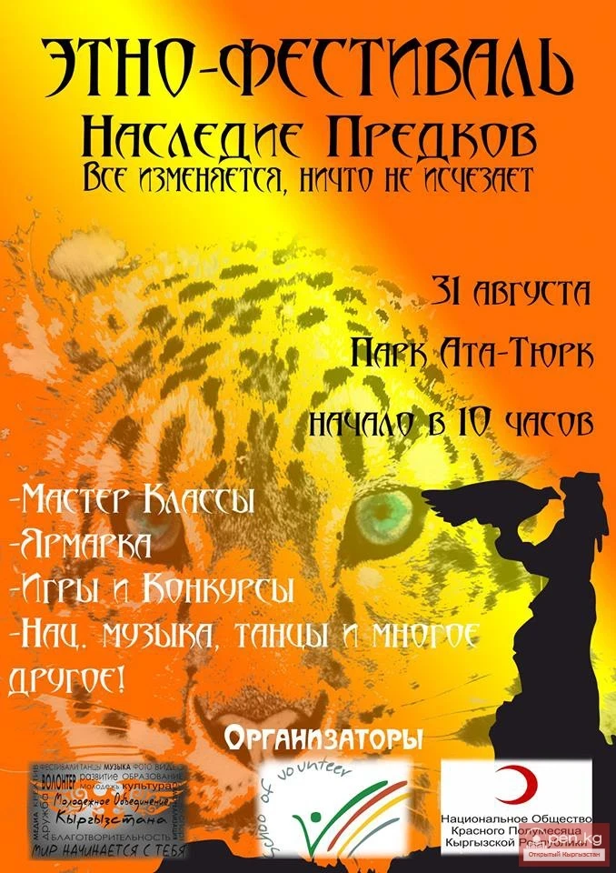 Culture is an inseparable part of every nation; for centuries, traditions, customs, and rituals have been passed down from generation to generation. Kyrgyz culture is diverse; the national games, cuisine, and customs of the Kyrgyz people are astonishing. Everyone can learn something new by getting acquainted with Kyrgyz culture, but despite this, modern society living in the territory of the Kyrgyz Republic has begun to forget all those foundations that were established long ago. The Youth Union of Kyrgyzstan, together with the Volunteer School and the National Society of the Red Crescent of Kyrgyzstan, is holding the first Charitable Ethno-Festival "Heritage of Ancestors" in the city of Bishkek outdoors, on the Day of Independence of the Kyrgyz Republic.