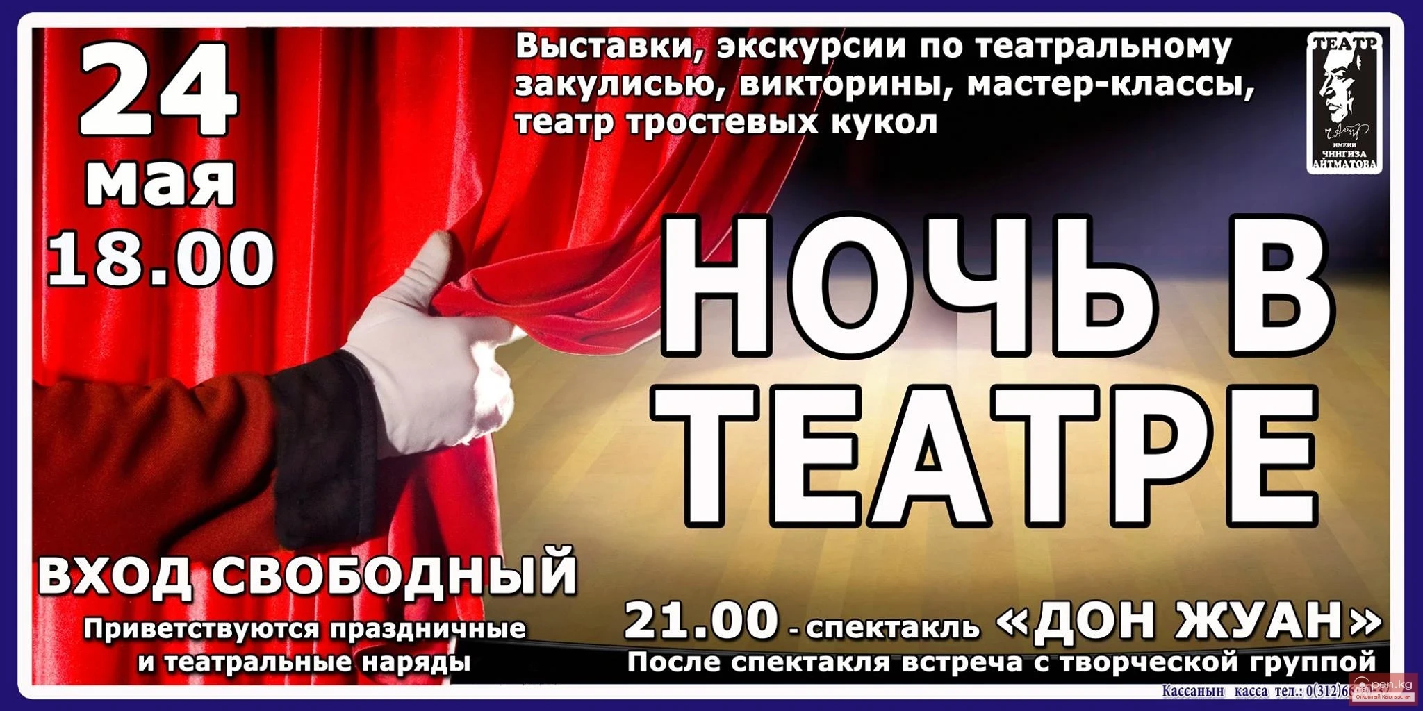 On May 24, from 18:00 to 00:30, the State National Russian Drama Theatre named after Ch. Aitmatov will host a Night at the Theatre.