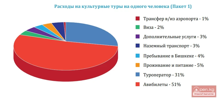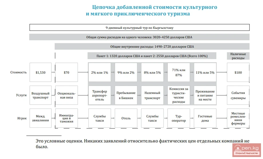 For example, accommodation and meals in guesthouses or rural homes are estimated at 20 USD per night, while a hotel in Bishkek is estimated at 60 USD per night, which constitutes 11% and 9% respectively of the total cost of the first package. It is evident that actual costs may vary depending on the locality and quality of accommodation. Similarly, airport transfers and ground transportation are estimated at 2% and 9% of the cost of the first package. The remaining part of the package, about 71%, is allocated to tour operators and covers the salaries of guides, activity expenses, and commissions.