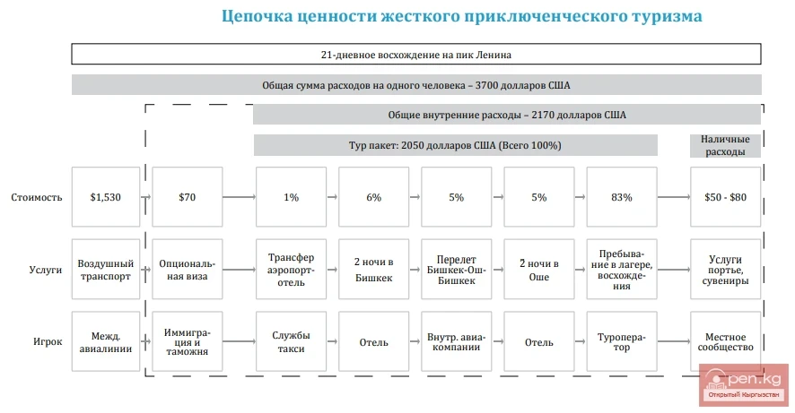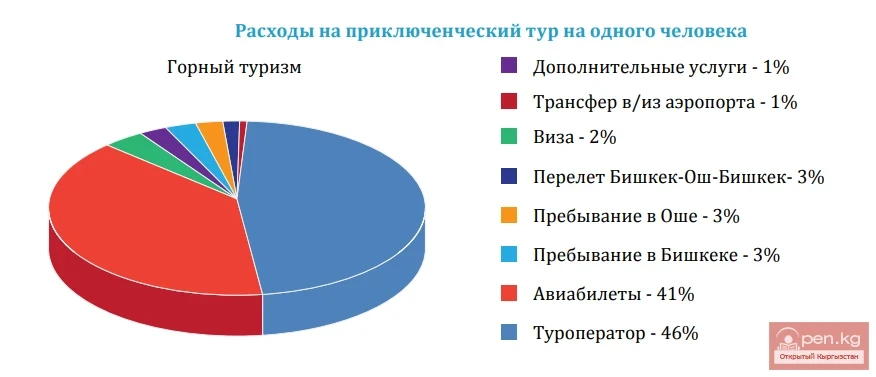 The cost of airline tickets, transfers to/from the airport and hotel, and visa fees are the same as for cultural and soft adventure tours. The main difference lies in the primary tourist product, mountaineering, which requires special equipment and food, acclimatization, and therefore a longer stay in the mountain camp. Thus, a higher percentage of the package cost (about 83%) goes to tour operators. Additionally, this specific route includes an extra two-day stay in Osh, on the way to/from the mountain camp. A typical flight from Bishkek to Osh is a domestic flight operated by one of Kyrgyzstan's airlines. A return ticket from Bishkek to Osh costs an average of $100 per person. Cash expenses, estimated at $50–80, include porter services for extra luggage, medical insurance, life insurance, food, and souvenirs.