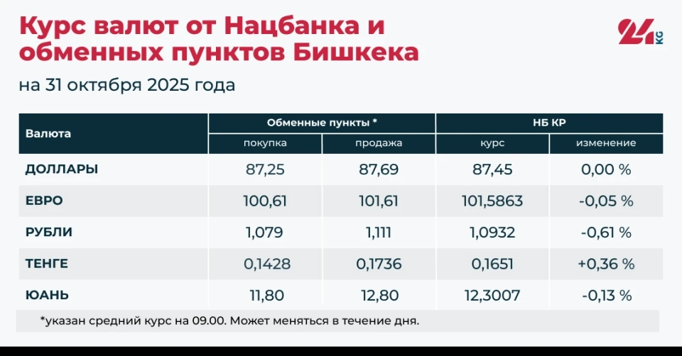 According to the latest data presented by the National Bank of Kyrgyzstan and exchange points in Bishkek, the US dollar has not changed its value, while the euro and Russian ruble have depreciated again. In contrast, the Kazakh tenge continues to strengthen.
