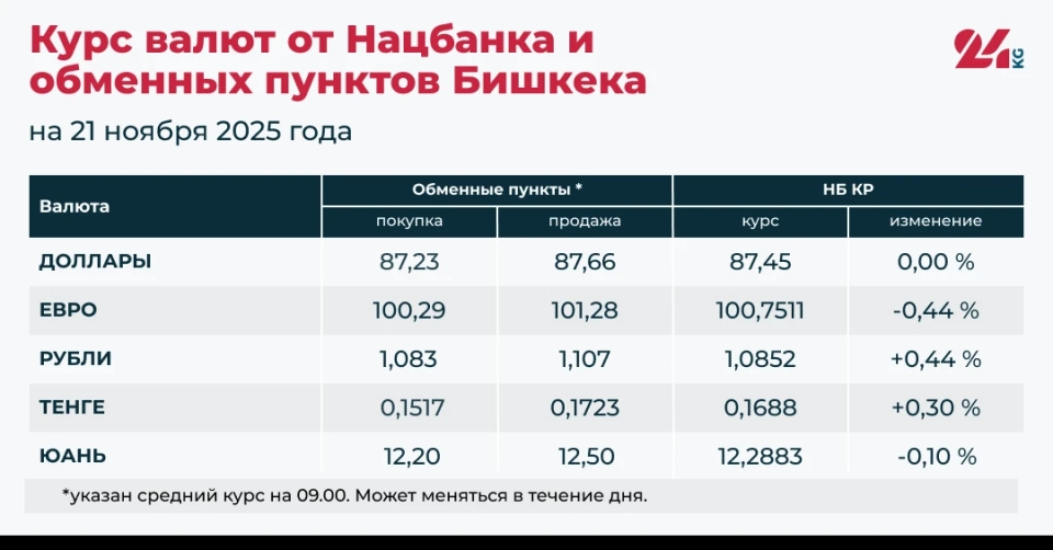 - Average rate in exchange offices: buying — 87.23 soms, selling — 87.66 soms.