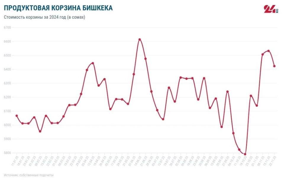 During 2024, the grocery basket became cheaper by 743 soms, with the lowest recorded price on September 14 — 5,510 soms. The highest price level was noted on April 13 — 7,018 soms.