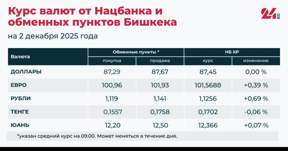 According to the National Bank of Kyrgyzstan and exchange points in Bishkek, the rates of the euro, ruble, and yuan have increased, while the Kazakh tenge has shown a decline. The dollar rate remained stable.