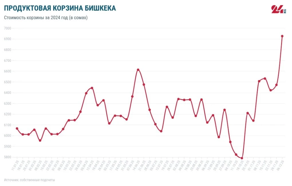 Throughout 2024, the price of the grocery basket decreased by 743 soms. The lowest price was recorded on September 14 — 5,510 soms, while the highest price was observed on April 13 — 7,018 soms.