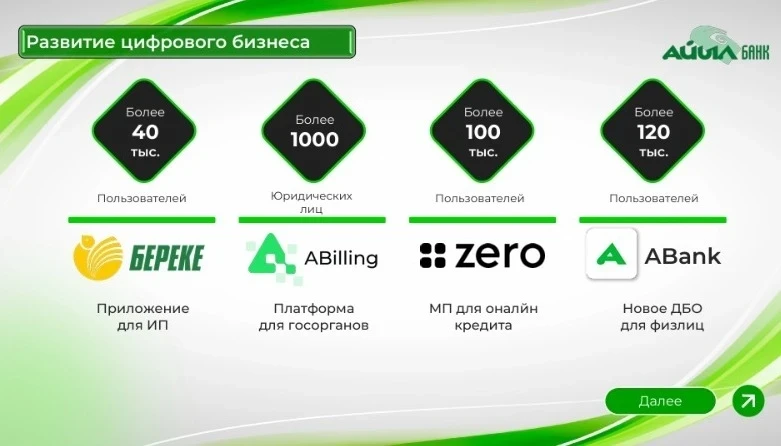 In 2024, the digital business platform “Berekе” was launched, along with a range of solutions for online lending and remote banking services for individuals and government institutions.