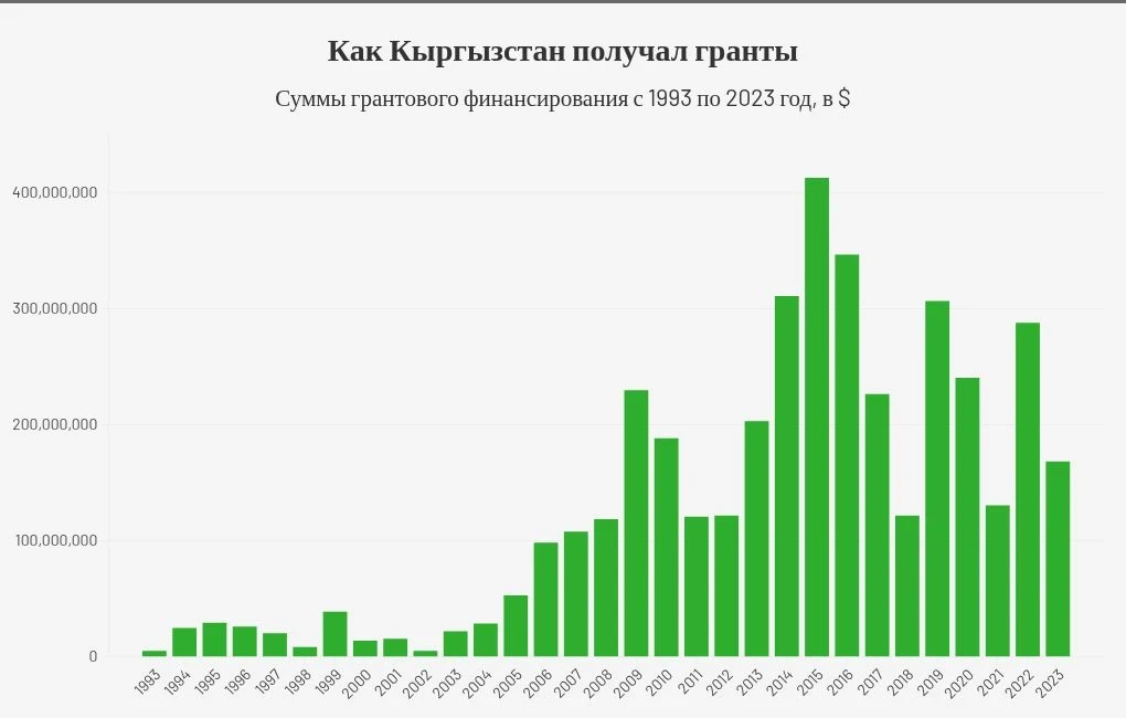The total amount of grant funding from 1991 to 2023 amounted to $4 billion, with the largest number of grants received by the republic in 2014-2016 — $1 billion 69.5 million. The smallest amounts were allocated in 1993 and 2002, each $5 million. The largest number of grants was aimed at budget support — $1.3 billion.