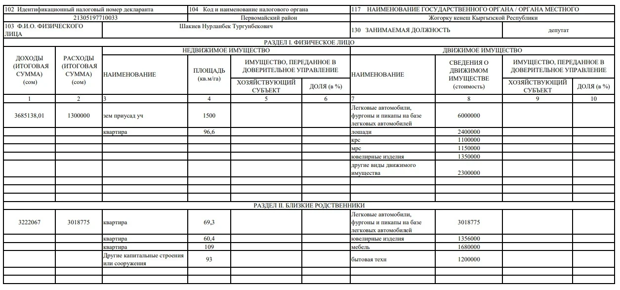Turgunbek uulu owns an apartment with an area of 96.6 square meters, a land plot of 1,500 square meters, as well as vehicles including cars, vans, and pickups, with a total value of 6 million soms. Additionally, he has horses worth 2.4 million soms, cattle worth 1.1 million soms, sheep worth 1.15 million soms, jewelry worth 1.35 million soms, and other movable property worth 2.3 million soms.